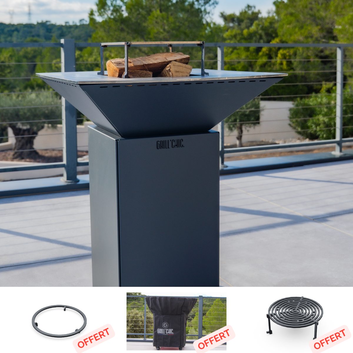 Pack Black Friday Brasero Cevenol Acier Thermolaqué Carré Normal 74x74x90 cm Gris Anthracite Double Cuve
